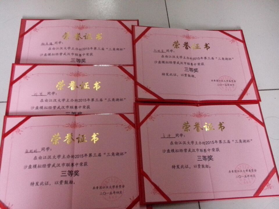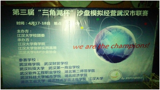 (通讯员:张明明)2015年4月17日-18日,我院物流管理专业、市场营销专业学生参加了由江汉大学校团委举办、江汉大学商学院、的第三届“三角湖杯”ERP沙盘模拟比赛。参加此次比赛的学校有江汉大学、湖北经济学院、武汉科技大学、湖北第二师范学院等十多所高校。我院由物流管理专业学生王冲、刘明星和市场营销专业学生张明明、刘望、杨秀娟组队参加本次比赛,并喜获三等奖。