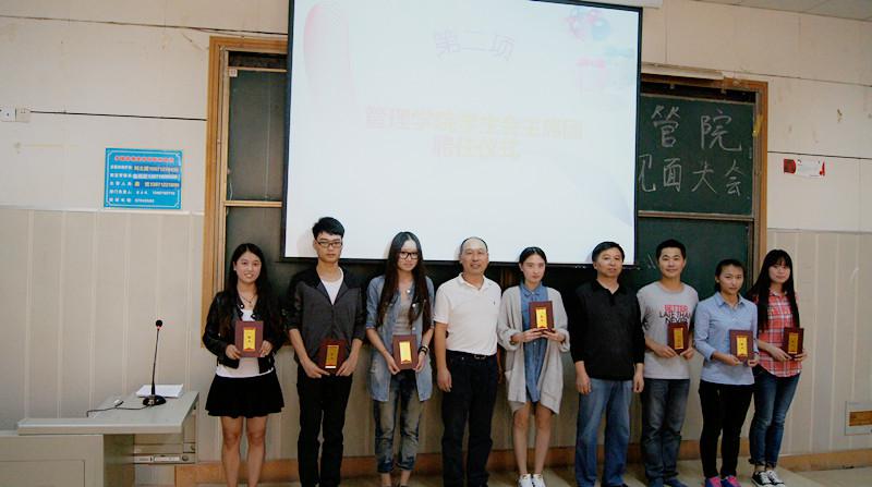 学院党总支副书记宋平宣读了管理学院《关于管理学院学生会干部的任职通知》。并对当选的同学表示祝贺。学院党总支书记戴正华、党总支副书记宋平一起为学生会主席团成员颁发聘书。