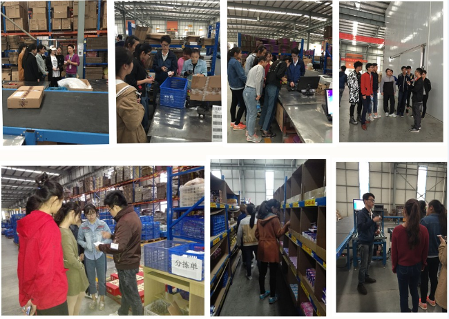 首先,五洲在线的姚老师带领老师和同学们参观了安德云仓(武汉)供应链管理有限公司的物流操作车间。到达厂房后,同学们便被高大的货架和众多的物流运输专用工具所吸引。在安德云仓五位业务组长的带领下,老师和同学们分组有序地参观了拣货区、仓库区、货架区、制单区、配送区及快递区,认真聆听了业务组长们对各区设施、功能和流程的详细介绍,并仔细观摩了不同工种的实践操作。