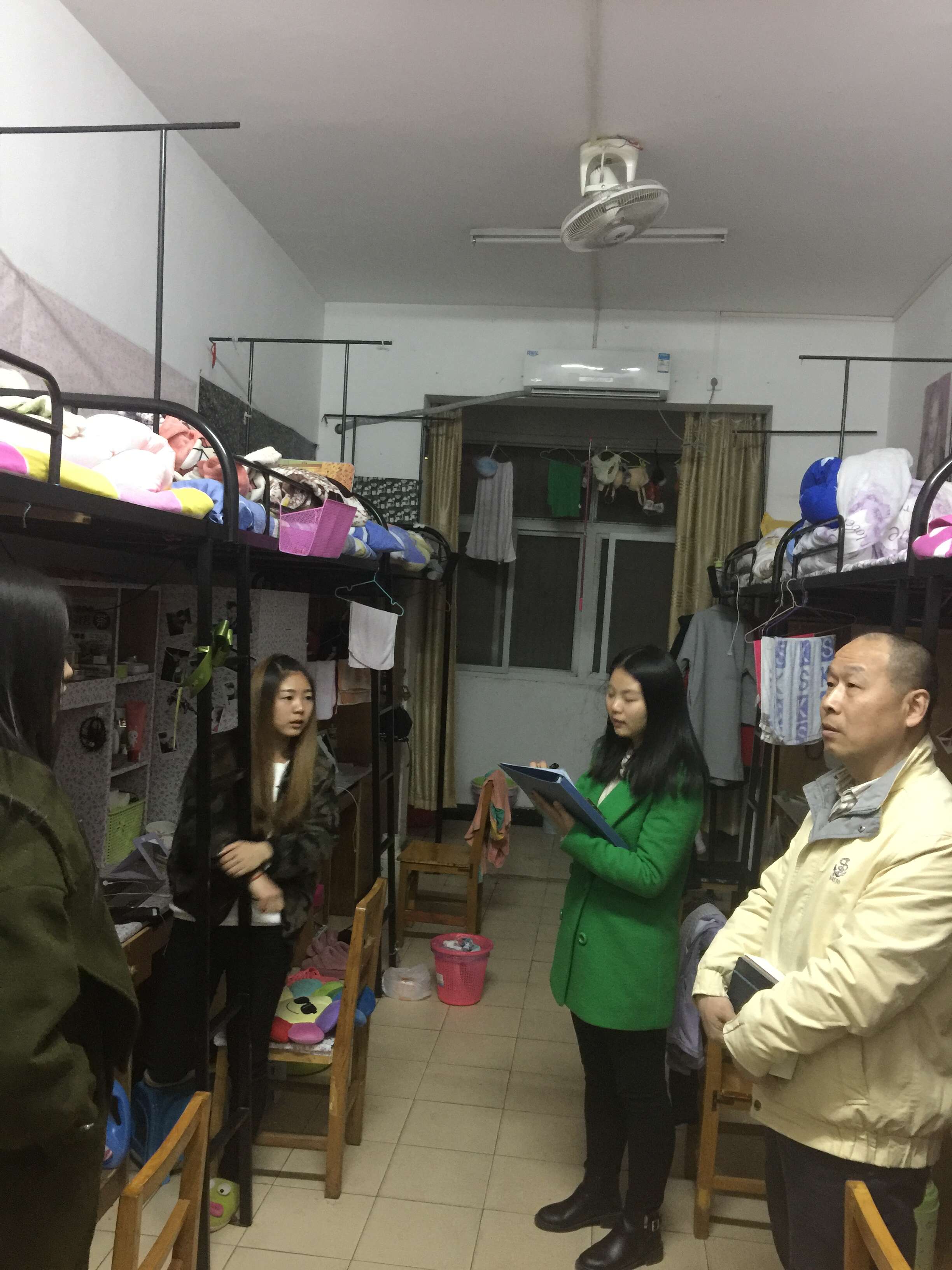 在中区10栋宿舍,宋平带领辅导员杨兰芳对2016级管理学院专科班级学生宿舍一间间地走访和检查,询问学生学习过程中有无需要解决的问题,提出利用空余时间学好计算机和英语的建议,并提醒学生近日天气气温变化大注意保暖问题。16级酒店管理专科班吴婷因桌面、床铺整洁受到了辅导员杨兰芳老师的表扬。