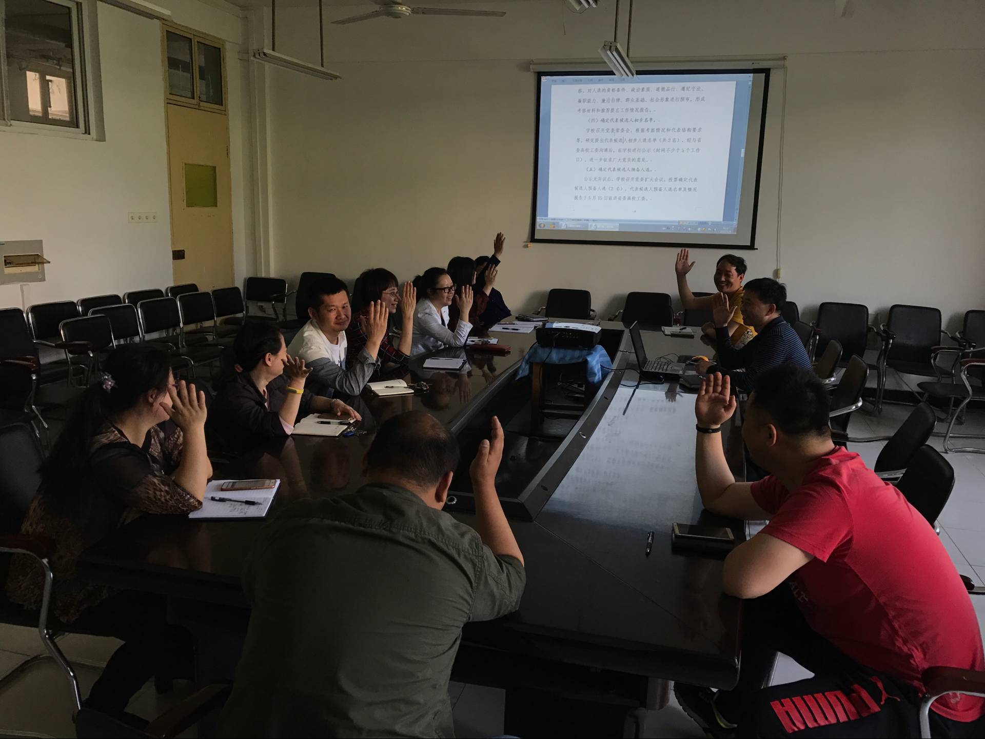 接下来,分支部开展“推荐提名省第十一次党代会代表候选人” 专题支部主题党日活动。在教工行政支部,按照主题党日活动程序,全体在党旗下重温了入党誓词,支部书记吴文娟带领大家诵读党章(节选)——第一章党员之第三条党员必须履行下列义务和第四条党员享有下列权利。组织全体党员学习了“湖南衡阳破坏选举案”和“辽宁贿选案”启示录。最后采取投票选举,根据得票情况,大家一致同意推选张国秀、左林霞为湖北省第十一次党代会代表候选人。 (吴文娟供稿)