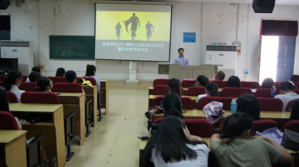 本网讯(企宣部记者 杨青)6月7日中午12时10分,管理学院2017暑期社会实践出征仪式暨安全教育宣讲会在旧图书馆报告厅3举行。党总支书记戴正华、副书记宋平、学工办主任、分团委书记魏豪、全体辅导员老师以及管理学院各实践队及安全员参加了会议。会议由分团委学生副书记叶莹主持。