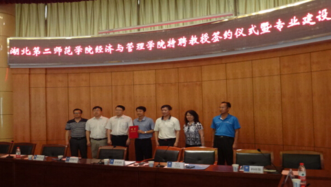 6月5日下午,经济与管理学院特聘中南财经政法大学博导舒伯阳教授签约仪式暨专业建设研讨会在行政楼1号会议室举行。副校长柯美录致欢迎词,校长胡仲军向舒伯阳颁发了特聘教授的聘书,与舒伯阳签订了特聘教授的聘任合同并发表讲话。经管院院长夏力教授主持授聘仪式。