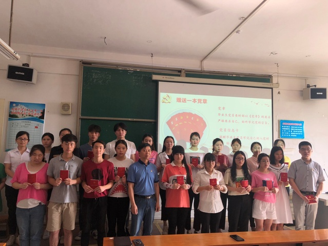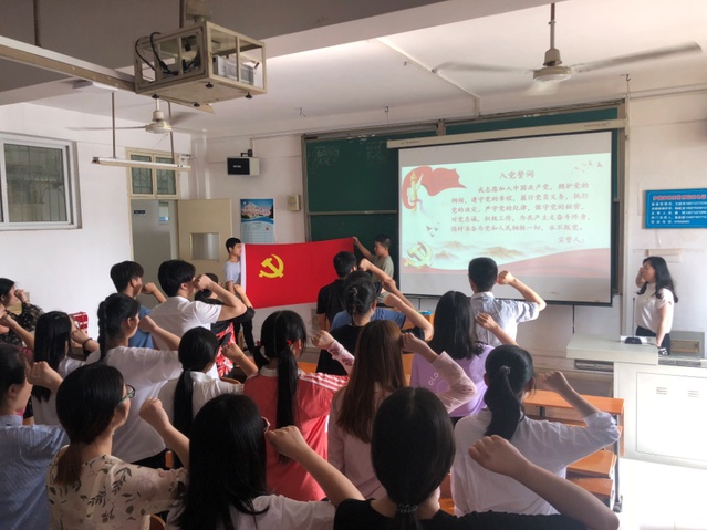 在庄重的国歌声中,活动正式开始,大会由学生支部书记施晴同志主持,首先她宣布了新发展党员名单,接着进行了新发展党员入党宣誓、同时老党员重温入党誓词,学生支部组织委员周慧东同志领誓。