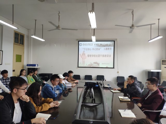 本网讯(通讯员 栾宇桐)11月4日中午,管理学院在2号楼三楼会议室召开了“不忘初心、牢记使命”主题教育之社团干部座谈会,管理学院党总支副书记刘兴、分团委书记周慧东、副书记席中刚出席并讲话,管理学院各社团负责人与院社团指导中心成员参加本次会议。