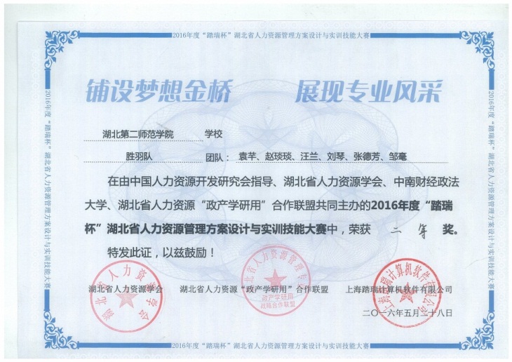 2016年度“踏瑞杯”湖北省人力资源管理方案设计与实训技能大赛荣获二等奖