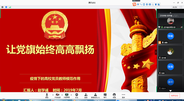 7月1日晚6点半,管理学院教师第二支部委员通过腾讯会议在线组织支部全体党员召开了“迎七一,讲战疫故事、悟初心使命”的组织生活会。除1名党员在海外访学,1名党员请病假,3名党员因网络故障无法进入线上会议,在群里查看会议思想截图外,支部其余18名党员均参与了此次会议。