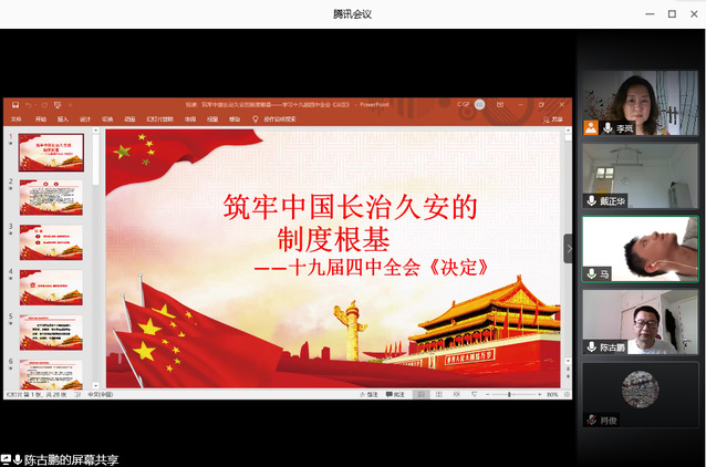 会议按照程序组织全体党员重温入党誓词后,支部纪检委员、财管系主任陈古鹏给党员同志讲了党课《筑牢中国长治久安的制度根基——党的十九届四中全会<决定>》。