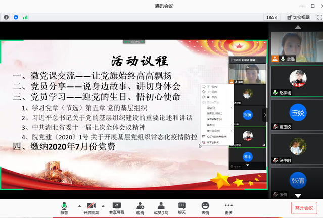 陈凡、吴丽慧等其他几位党员同志也分享了其身边的抗疫故事,并讲了自己的切身体会。最后,由支部书记蔡璐组织大家进行了主题党日学习,同志们重温了党章,再悟初心和使命,重点学习了党章(节选)第五章《党的基层组织》相关内容、习近平总书记关于党的基层组织建设的重要论述和讲话、中共湖北省委十一届七次全体会议精神及我院党建〔2020〕1号《关于开展基层党组织常态化疫情防控“七个一”行动的通知》,并组织大家缴纳了2020年7月份党费。