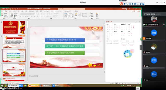 首先是微党课交流,由赵学彧同志给大家分享了其根据支部各位党员提供的素材所制作的微党课PPT,党课主题为:疫情下的高校党员教师模范作用,赵博士讲到了五个带头:带头学文件、带头上前线、带头干工作、带头帮群众、带头履职责。大家一边聆听赵学彧同志所讲的内容,一边做笔记,认真反思和领会在当前疫情下,我们作为高校党员教师所应发挥的模范作用。