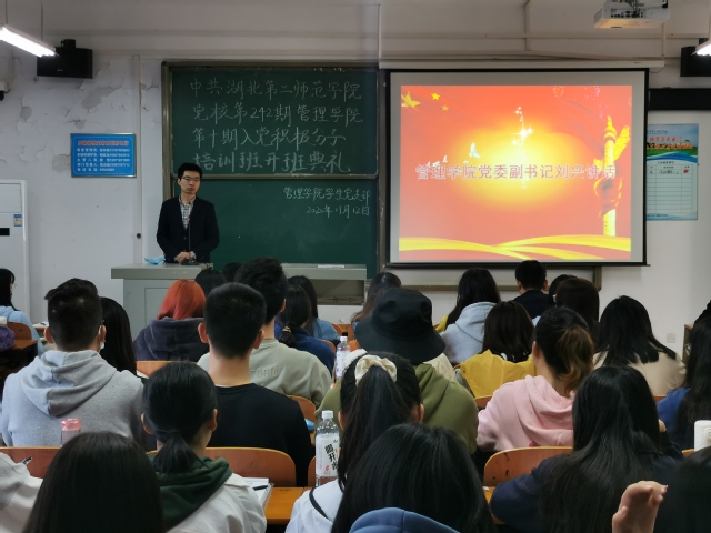 本网讯(通讯员 张吴杰 邓思婕)2020年11月12日14时45分,湖北第二师范学院党校第242期管理学院第十期入党积极分子培训班开班典礼在1号教学楼1204教室举行。管理学院党委副书记刘兴,管理学院分团委书记周慧东,管理学院学生第一党支部书记杨兰芳,管理学院第二党支部书记席中刚以及管理学院各辅导员老师出席本次开班典礼。典礼由18级物流管理1班廖冰枝主持。