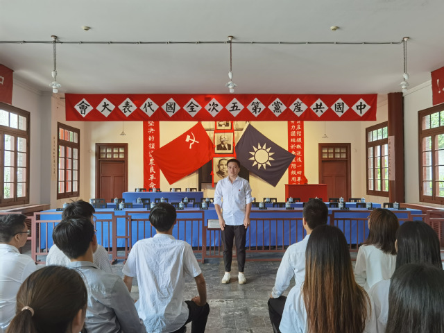 在正式参观前,管理学院学生第一党支部书记杨兰芳带领学生党员重温入党誓词。声声誓词响彻会址,同学们的青春活力可见一斑。随后,大家参观中国共产党第五次全国代表大会开幕式会场,更进一步了解中共五大在党的发展历程中起到的无可替代的作用。杨兰芳在参观过程中为大家讲解到,中共五大提出了争取无产阶级对革命的领导权,建立革命民主政权和实行土地革命的正确原则,为党的思想理论建设做出积极贡献。