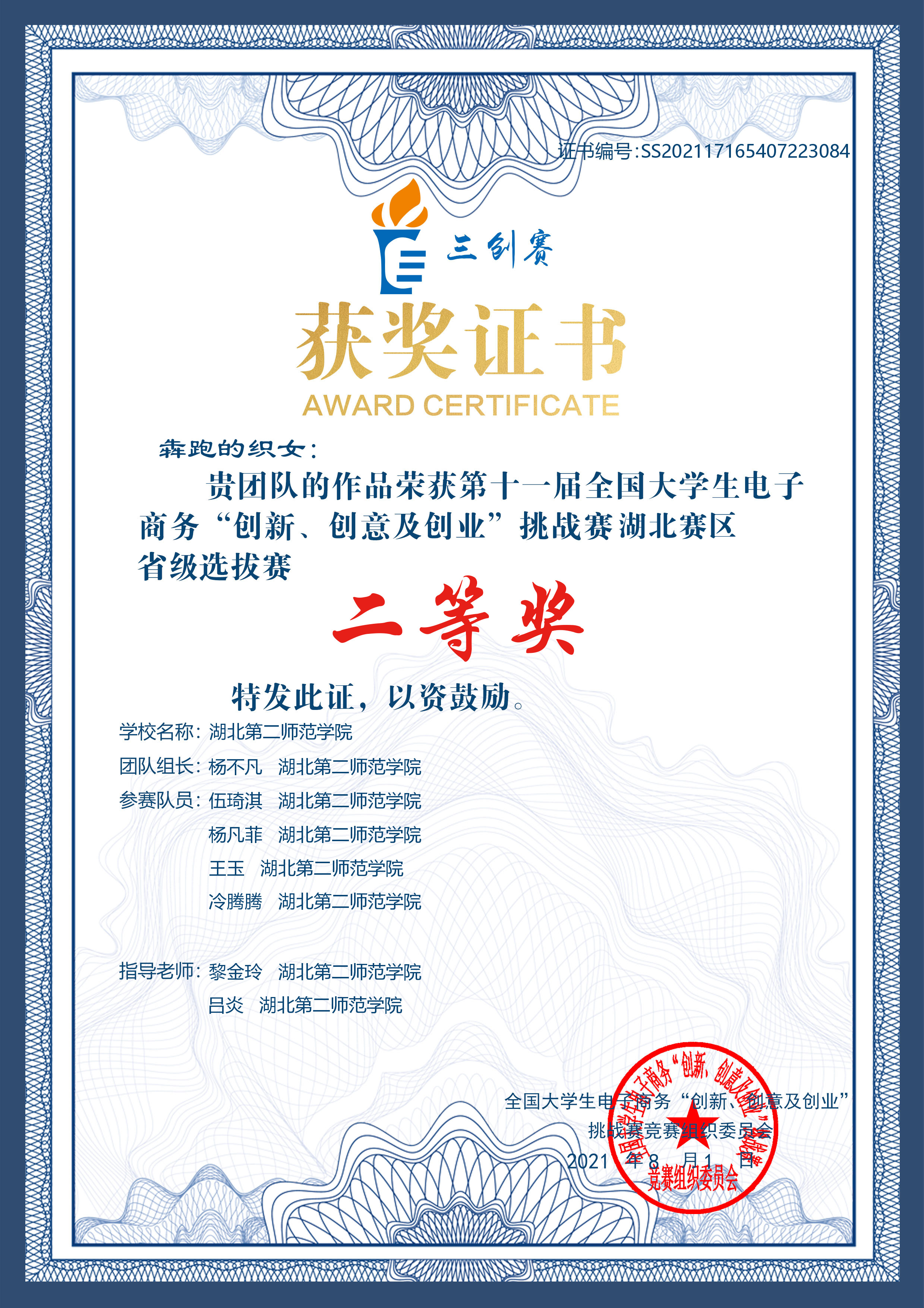 近日,第十一届全国大学生电子商务“创新、创意及创业”挑战赛圆满落幕,我院学子50多支队伍报名,在经历了院内选拔、校内角逐之后,有六个团队进入湖北省赛,最终两个团队在省级选拔赛中分别荣获二等奖和三等奖。其中黎金玲、吕炎老师带领的由杨不凡、杨凡菲、伍琦淇、冷腾腾、王玉组成的“犇跑的织女”队荣获省赛二等奖,马勇、黄长文老师带领的由唐靖歆、胡浙、黄可、邢云鹭组成的“湖二师也有樱花” 队荣获省赛三等奖。