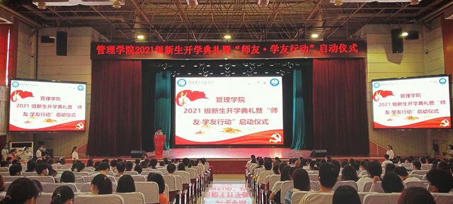 本网讯(宣传部记者 陈慧)2021年9月23日,管理学院2021级新生开学典礼在学校大礼堂圆满举行。管理学院党委书记戴正华,院长夏仕平,副院长陈艳明、蔡璐出席典礼,副书记刘兴主持会议。学院各教学系部专业负责人、系主任、班导师、辅导员和老生代表及2021级全体新生参加活动。