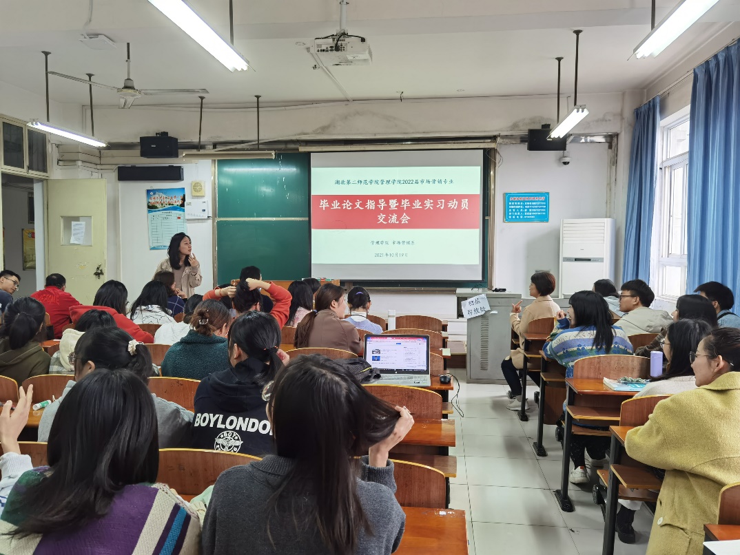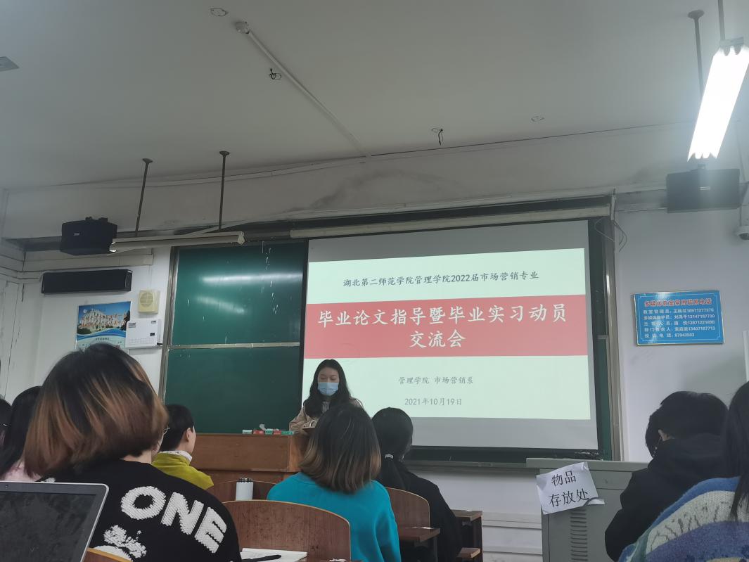 2021年10月19日下午13点,市场营销系2022届毕业论文指导暨毕业实习动员交流会于2410室正式举行。市场营销系主任陈凡博士,专业负责人刘爱君副教授,市场营销系教师栾晓梅副教授、王继平副教授、孙超副教授、许合先副教授、阳健副教授、辅导员李婷老师及2022届市场营销系全体毕业生参加了本次交流会。
