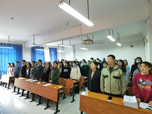 伴随庄严神圣的国歌声,典礼正式开始。学生第二党支部宣传委员周杰宣读党校学习管理规定及党校优秀学员评选办法。
