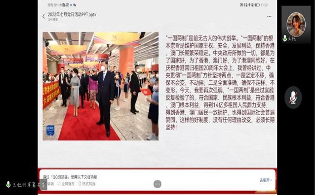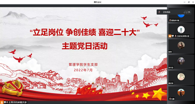 本网讯(通讯员云瑶)2022年7月27日中午,管理学院学生党支部于腾讯会议开展“立足岗位 争创佳绩 喜迎党的二十大”主题党日活动,管理学院学生党支部全体党员参加。活动由学生第二支部书记席中刚主持。