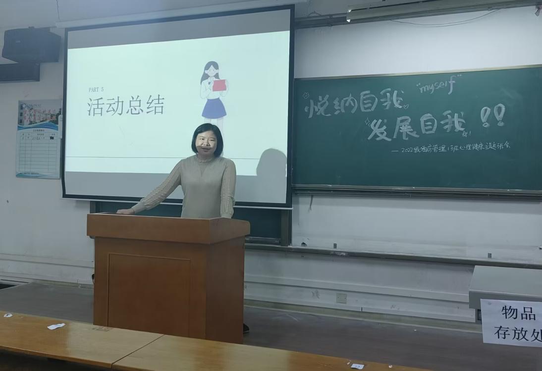 本网讯(宣传部见习记者 吴晶) 为了进一步普及心理健康知识,提高同学们的心理健康意识,促进学生个性发展。11月10日晚,2022级酒店管理1班举办了“悦纳自我,发展自我”的心理健康主题班会。班导师李丽霞博士和酒店管理专业教师罗银川博士莅临指导本次班会,班会由班级心理委员郭媛媛主持。