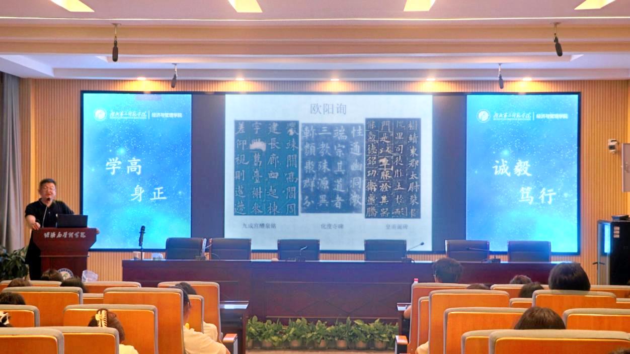 本网讯(通讯员 易帅敏 王琬)为深入学习贯彻党的二十大精神,落实立德树人根本任务,大力弘扬中华优秀传统文化,培养大学生核心素养。4月17日晚,经济与管理学院在学院多功能报告厅举办“大学生核心素养之书墨浓香书法训练营”开班仪式。本次活动特邀我校优秀校友、湖北省书法家协会会员、湖北省书法教学名师黄逸群老师为我院学生授课。湖北省书画家协会副秘书长王优老师、经济与管理学院党委副书记李京老师、经济与管理学院团委负责人徐梅馨老师出席了开班仪式,来自学院21、22级69名学员参加培训。