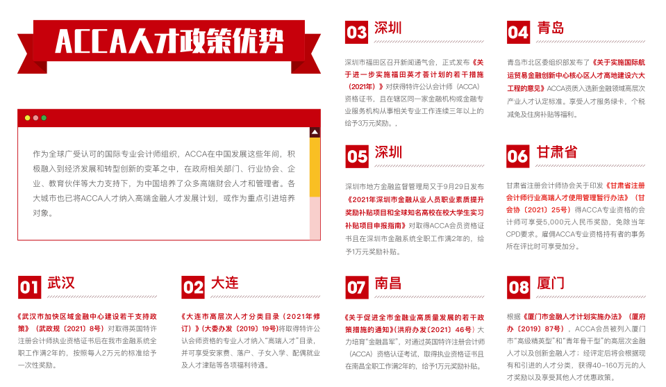 作为全球广受认可的国际专业会计师组织,ACCA在中国发展这些年间,积极融入到经济发展和转型创新的变革之中,在政府相关部门、行业协会、企业、教育伙伴等大力支持下,为中国培养了众多高端财会人才和管理者。各大城市也已将ACCA人才纳入高端金融人才发展计划,或作为重点引进对象。