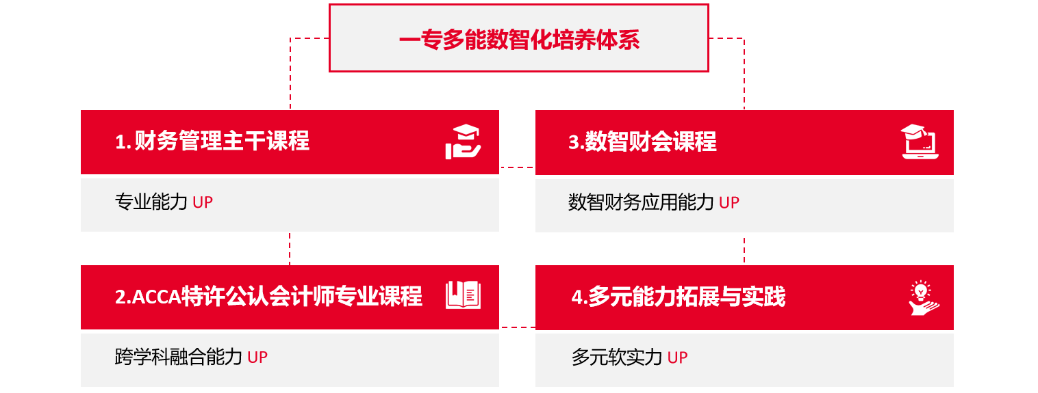 财务管理(ACCA方向班)聚焦新兴技术应用下财会专业学生的核心素养与技能,以当前全球大型企事业单位用人需求为导向,搭建起“财务管理主干课程+ACCA专业课程+智能财会课程+多元能力拓展与实践”的一专多能数智化培养体系,教学由浅入深、循序渐进,课程内容先进、覆盖广、综合性强,聚焦会计、金融、财务管理、智能财务应用等学科交叉领域,旨在培养熟练掌握国内外会计、审计准则及相关法规,精通财经英语与智能财务应用,熟悉商业运行整体逻辑,具备跨学科整合能力、全球化视野与前瞻思维,综合素质拔尖的未来型数智财会人才。