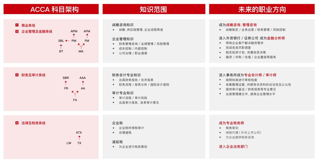 ACCA课程大纲共分三个阶段13个科目,并可在相应阶段完成后获得不同等级的资格证书。其中我院ACCA方向班学员可申请6门免试。课程包含商业、会计、审计、金融、业绩管理、战略管理、人力资源知识体系。考试难度循序渐进,全英文作答。学生未来将拥有广阔的就业选择面,可在跨国公司、专业性会计师事务所、国企与金融机构等各类大型企事业单位从事财务、税务、商业分析、投融资、运营与管理等高薪职业。