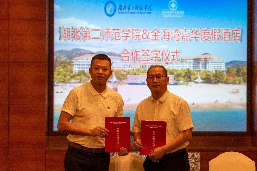 在学院领导、酒店管理层及学生的共同见证下,湖北第二师范学院经济与管理学院刘元锋书记以及金海湾度假酒店总经理余波先生共同签署校企合作协议书,它将开启湖北第二师范学院与金海湾嘉华度假酒店校企合作项目的新篇章。