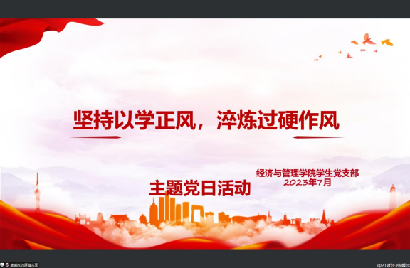 本网讯(通讯员 张馨元)7月27日中午,经济与管理学院学生党支部组织全体党员于线上腾讯会议开展“坚持以学正风,淬炼过硬作风”主题党日活动。本次活动由经济与管理学院学生第二党支部书记席中刚、第三党支部书记徐梅馨主持,经济与管理学院学生党支部全体党员参加。