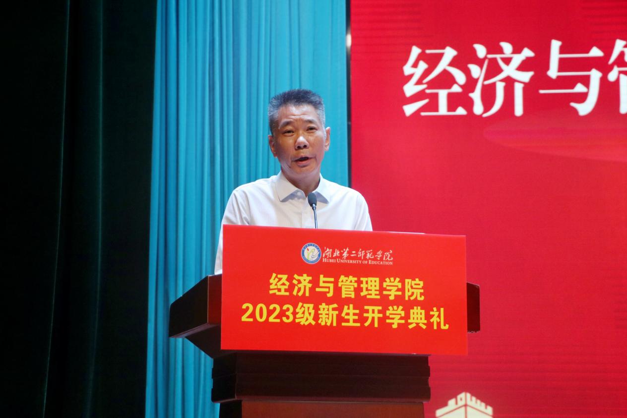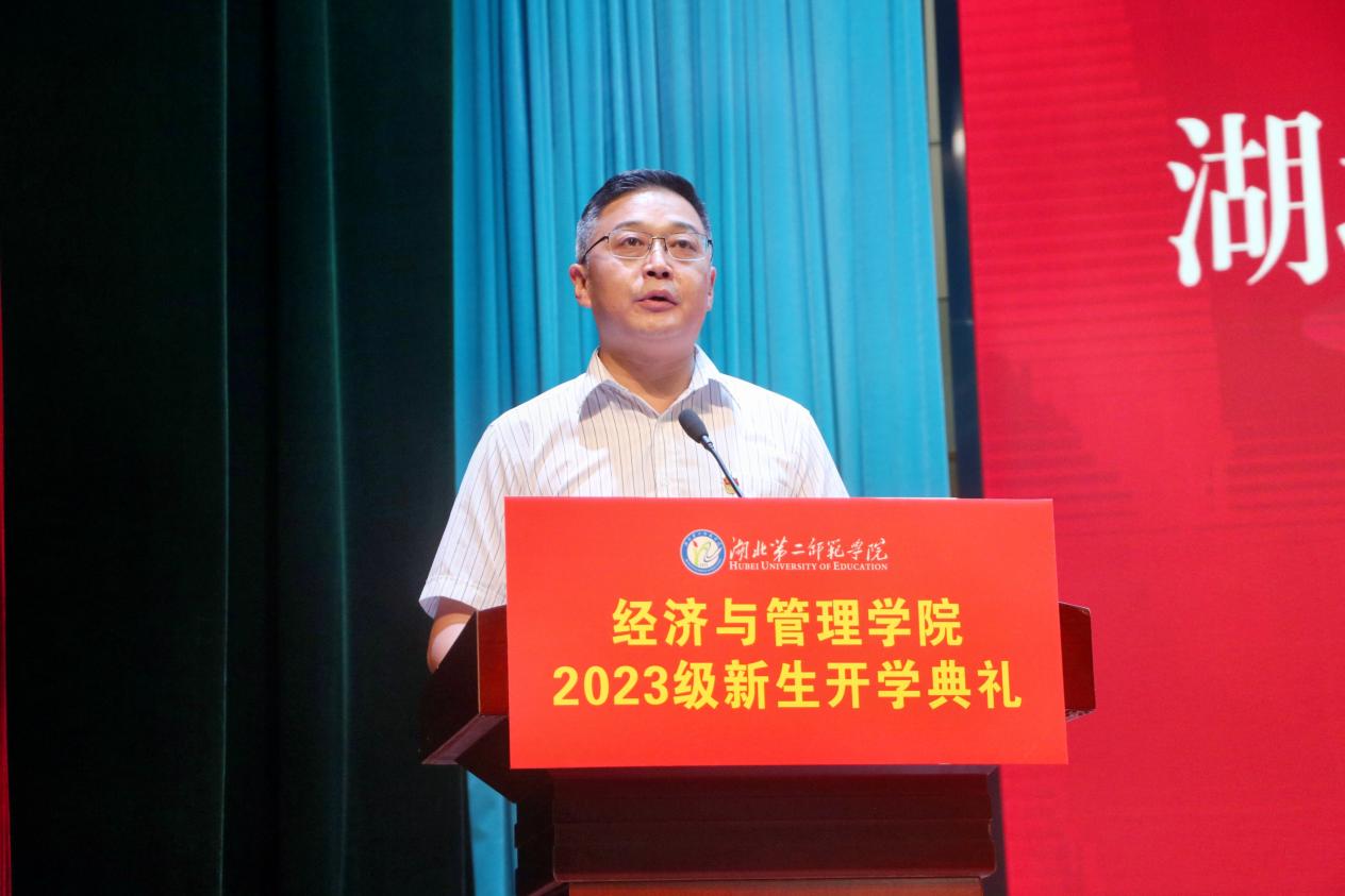 陈勇代表学校对经管学院2023级新生的到来表示热烈的祝贺和欢迎,并希望同学们成为重任在肩的未来建设者,秉承二师人“学高、身正、诚毅、笃行”的精神品质,不断立下建功立业的远大志向。