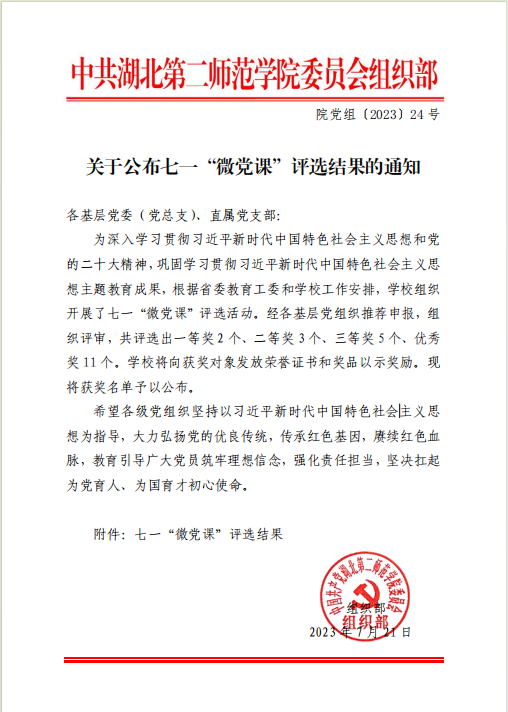 本网讯(通讯员 谭芳)近日,中共湖北第二师范学院委员会组织部公布七一“微党课”评选结果,经济与管理学院推荐申报的3项七一“微党课”作品获奖,其中席中刚老师的《青春心向党,传承二七革命精神》获评校级二等奖,徐梅馨老师的《忆峥嵘岁月,弘首义精神》和马勇老师的“教育现代化促进中国式现代化目标实现”获评优秀奖。