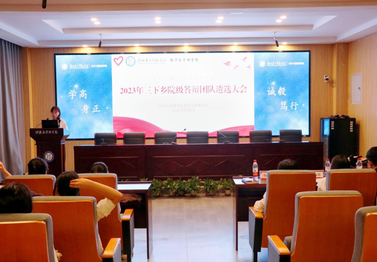 本网讯(通讯员 谭芳)为深化实践育人实效,总结社会经验成果,发挥优秀团队的示范引领作用。9月8日中午,经济与管理学院于2号楼三楼多功能会议室举行2023年三下乡院级答辩团队遴选大会。经济与管理学院分团委负责人徐梅馨、大学生心理健康协会指导老师杨兰芳以及“三下乡”团队代表参会。会议由青年志愿者协会肖红佳主持。