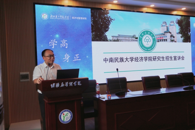李波从发展历史、科学研究、师资力量、学生就业、校园生活及人才培养等方面详细介绍了中南民族大学概况,并重点讲解了理论经济学、应用经济学、金融专业硕士点、农业管理专业硕士点等学位点。李波指出,学院研究生教育旨在培养具有较高政治思想素质,德智体全面发展,努力为建设中国特色社会主义服务的高层次专业人才,希望能够借此契机,吸引湖北第二师范学院更多优质生源。