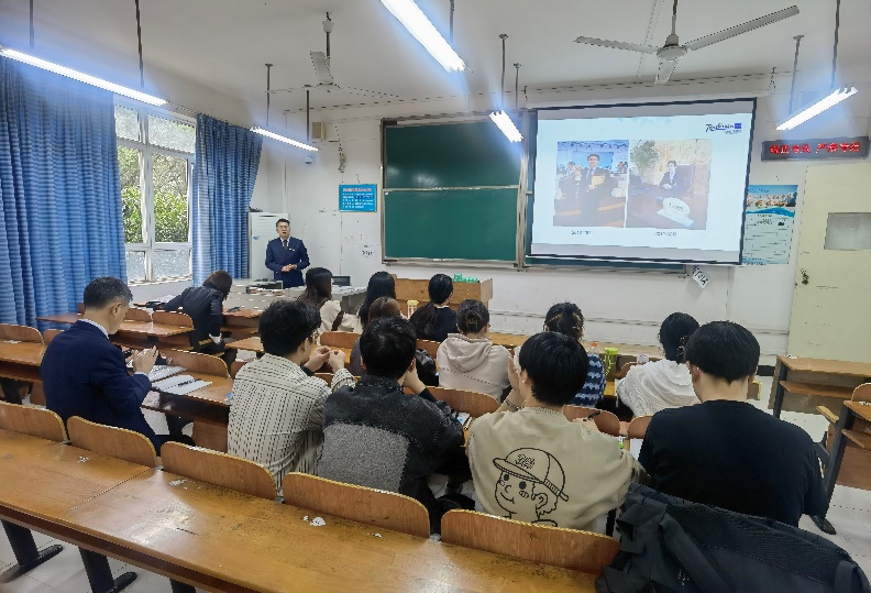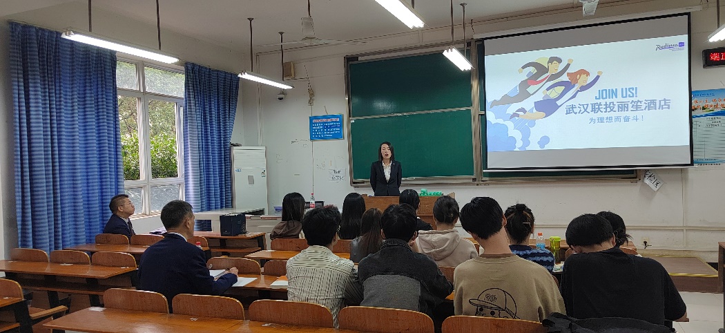 范良军副总监与陈欣总监首先在2208教室与我院20级酒店管理1班的学生进行了亲切交流。据悉,范副总监是我校08级酒店管理专业的优秀毕业生,他主要结合自己在酒店的工作经历与对客沟通技巧与我校2020级酒店管理1班的同学进行了亲切交流,陈欣总监则以武汉联投丽笙酒店为例与同学们就企业文化进行了深入的探讨,最后还给同学们赠送了精美的礼品。