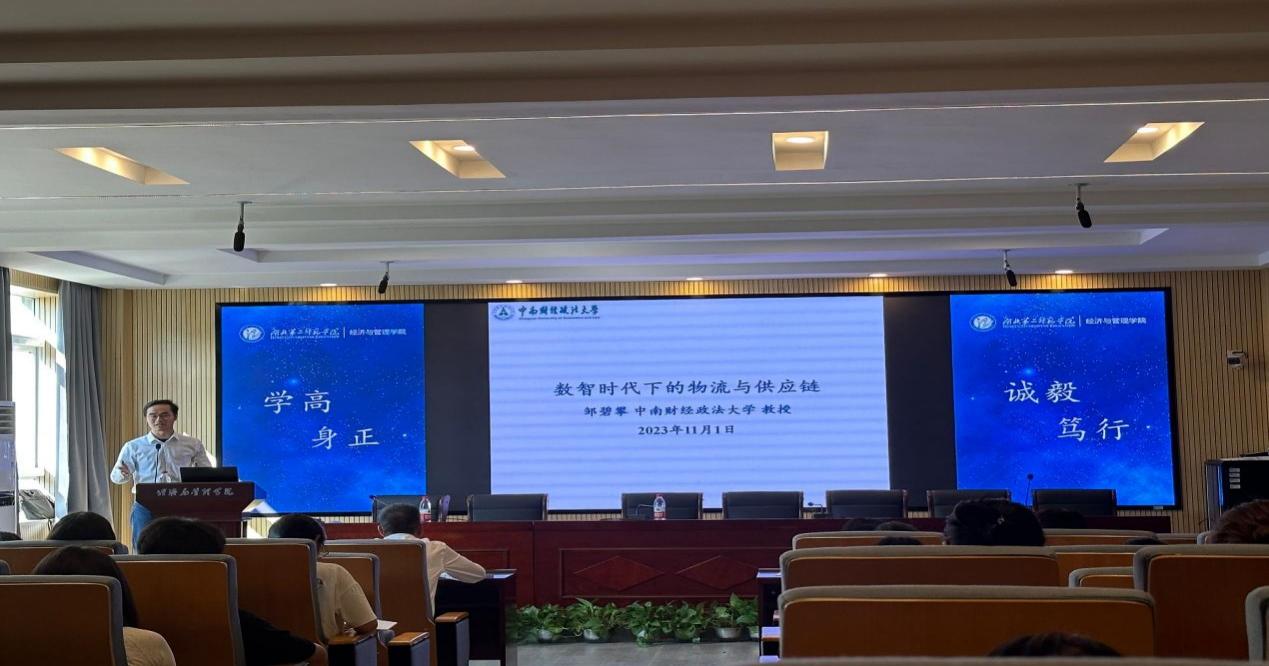 本网讯(通讯员 吴昊旭)为了一步增进同学们对物流管理专业的认识,把握数智时代下智慧物流与供应链发展趋势,11月1日下午,经济与管理学院在学院多功能报告厅举行“光谷经管论坛”第八期。本期论坛特邀中南财经政法大学邹碧攀教授做题为“数智时代下的物流与供应链”的专题讲座。经济与管理学院院长陈池波教授、物流系全体教师以及2023级物流管理专业全体新生参加本期讲座。陈池波院长为论坛致辞,对邹碧攀教授的到来表示热烈欢迎,对即将开始的讲座充满期待,陈池波院长寄语2023级物流管理专业新生要以专业为傲,以读书为乐,以修身为本。
