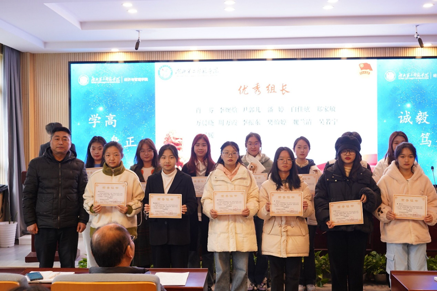 徐梅馨宣读《关于表彰经济与管理学院2023年“青年马克思主义者培养工程”团校第六期暨“新起之秀”新晋学生骨干培训班优秀团队及个人的决定》,评选出3个优秀部门、13位优秀部长和11位优秀学员,16个优秀笔记。并由李京为优秀团队、优秀组长颁发荣誉证书,周慧东为优秀学员颁发荣誉证书,席中刚为优秀笔记获得者颁发荣誉证书。