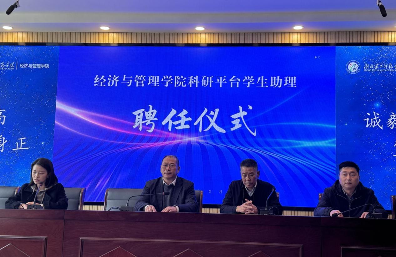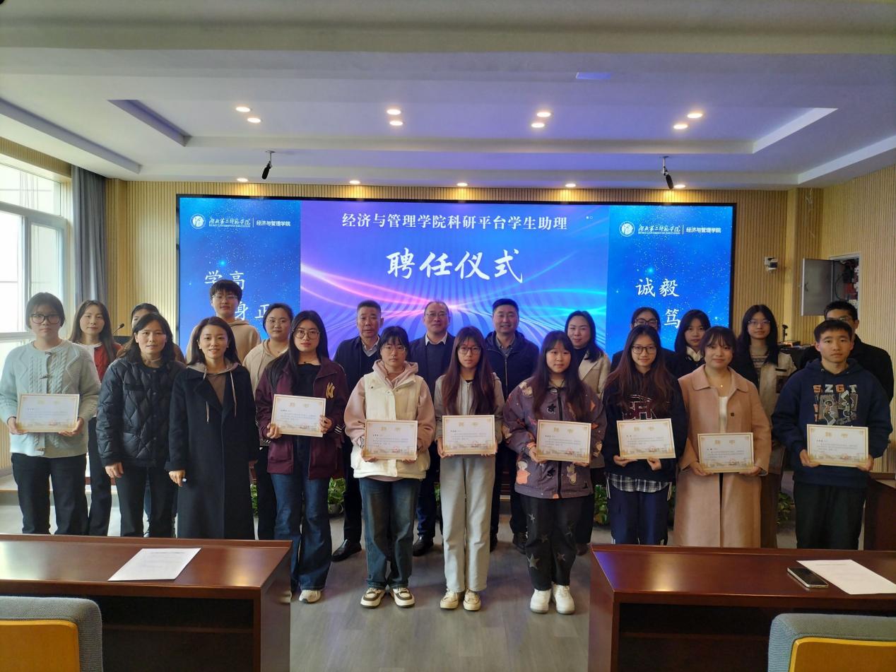 本网讯(通讯员 谭芳 肖月阳)为提升学院科研平台的工作实效,培育学生的综合素养,将科研育人落到实处,结合学院的发展实际,3月14日13点,经济与管理学院科研平台学生助理聘任仪式于2号楼3楼报告厅顺利举行。经济与管理学院党委书记刘元锋、院长陈池波,党委副书记李京,副院长常静,财务处副处长张爱华,科研处副处长贺青,各平台主任汤中明、张红霞、张海枝以及学生助理出席,此次仪式由常静主持。