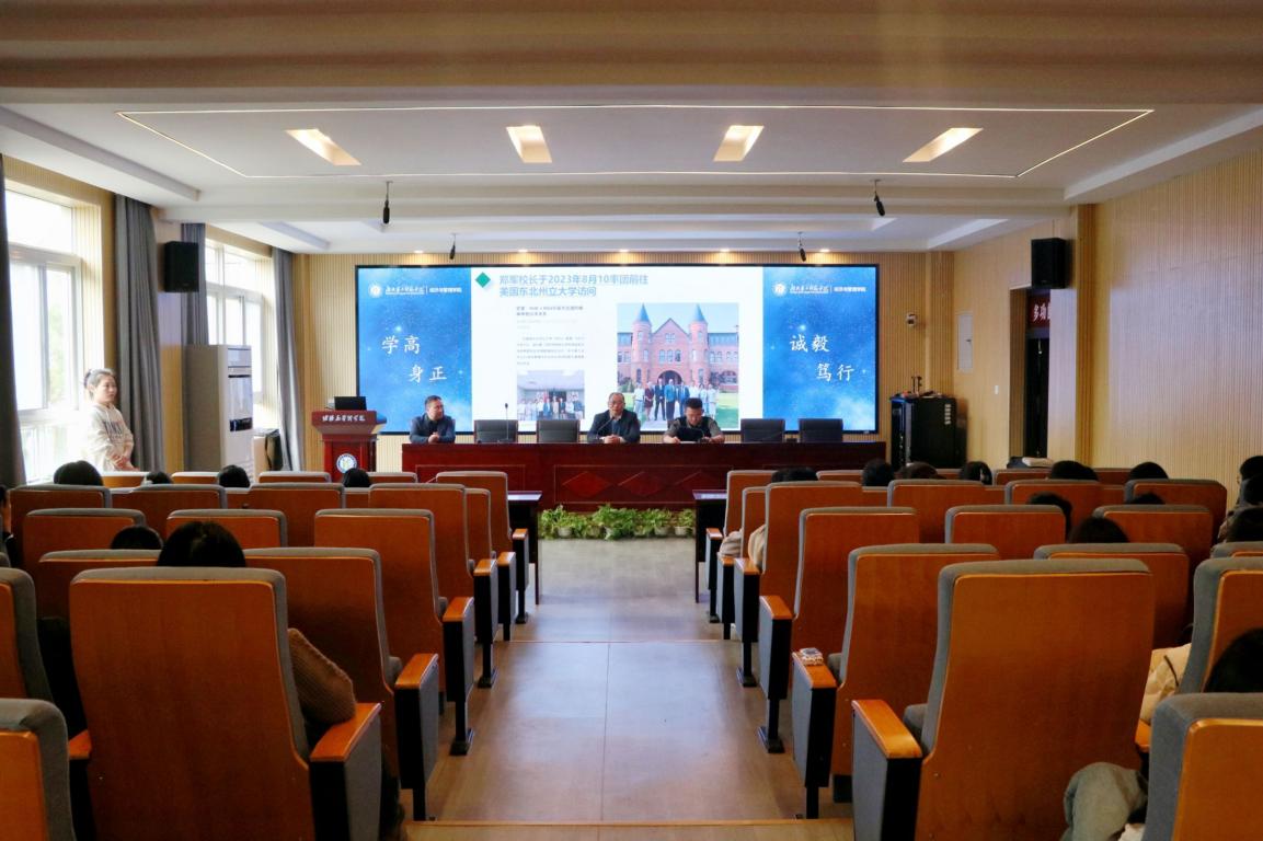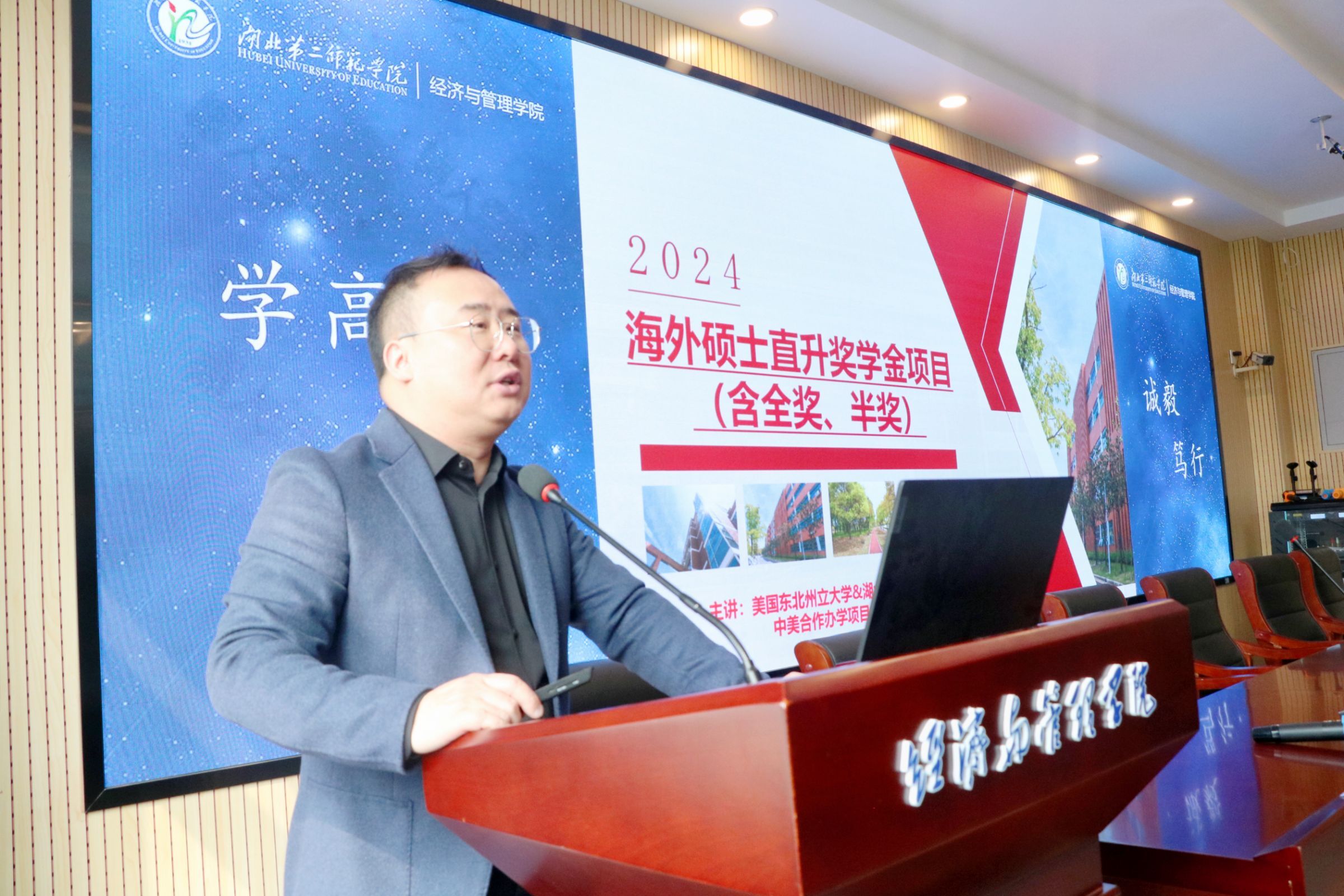 本网讯(通讯员 魏雪晴 徐昌海)3月15日下午,经济与管理学院在2号楼3楼多功能报告厅开展美国东北州立大学考研宣讲会。经济与管理学院党委书记刘元锋,国际交流与合作处伍晓飞,美国东北州立大学校方代表朱波出席,21级财务管理3班和21级会计学2班学生参加。本次宣讲会由朱波主讲。