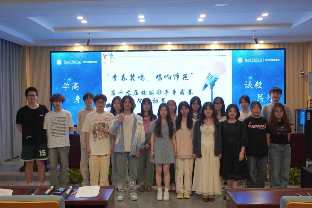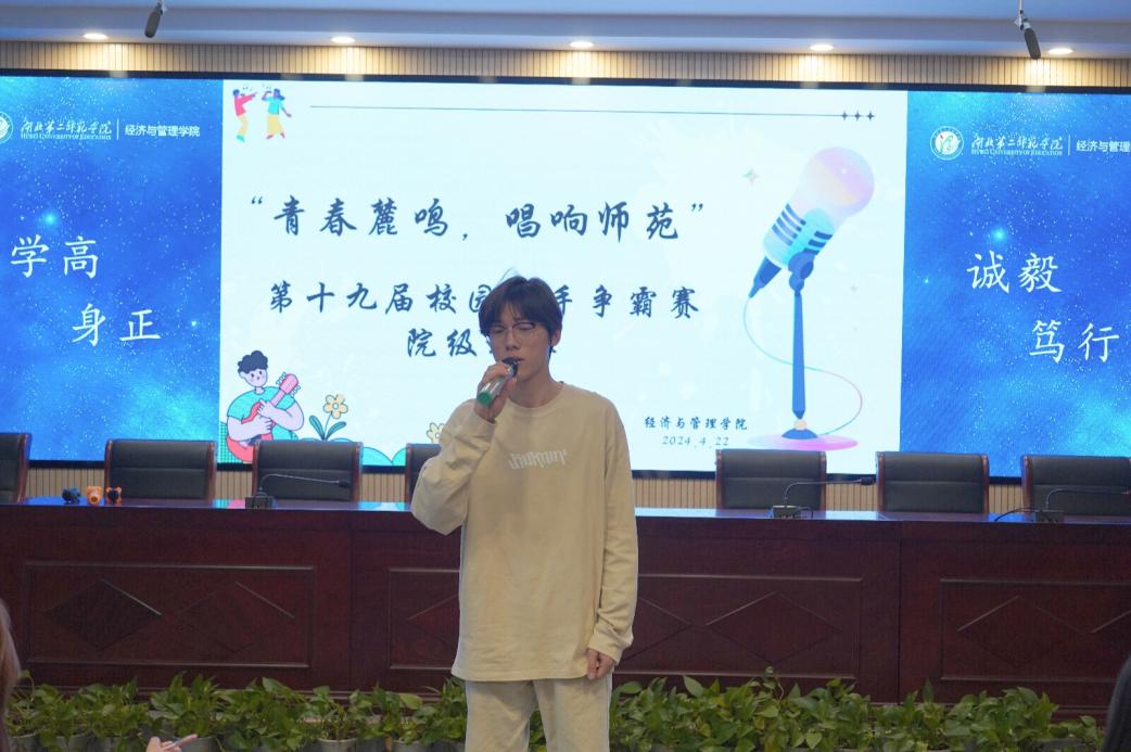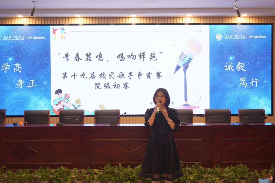 本网讯(通讯员 魏雪晴 潘雨馨)4月22号下午,经济与管理学院(以下“经管院”)于2号楼三楼报告厅顺利举行第十九届“青春麓鸣,唱响师苑”校园歌手争霸赛初赛,经管院分团委学生副书记李彦庆、李悦箐,经管院学生会执行主席黄新敏和经管院学生会主席团成员贾一珍,文体部部长郭媛媛,副部长杨郭昕、黄茂担任评委。本次比赛由23级市场营销1班向兵主持。