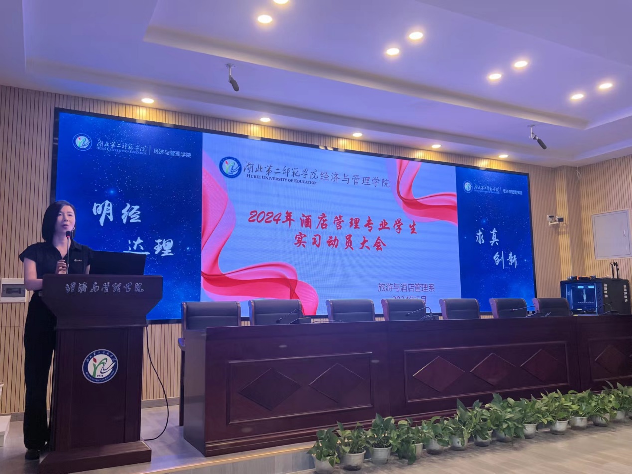 本网讯(通讯员黄菊)2024年5月30日下午,我院旅游与酒店管理系师生在学院三楼多功能报告厅举行2024年酒店管理专业实习动员大会。此次大会旨在让同学们充分认识到酒店管理专业实习的重要性,并为即将到来的专业实习做好充分的准备。会议由旅游与酒店管理系主任李丽霞老师主持。