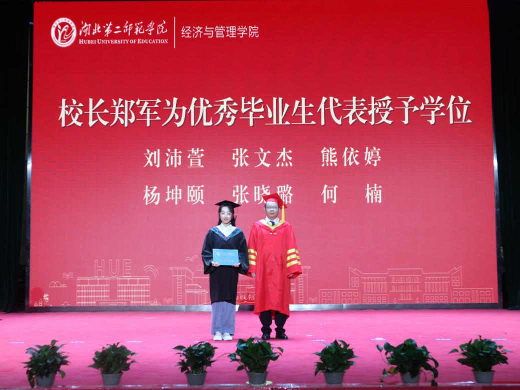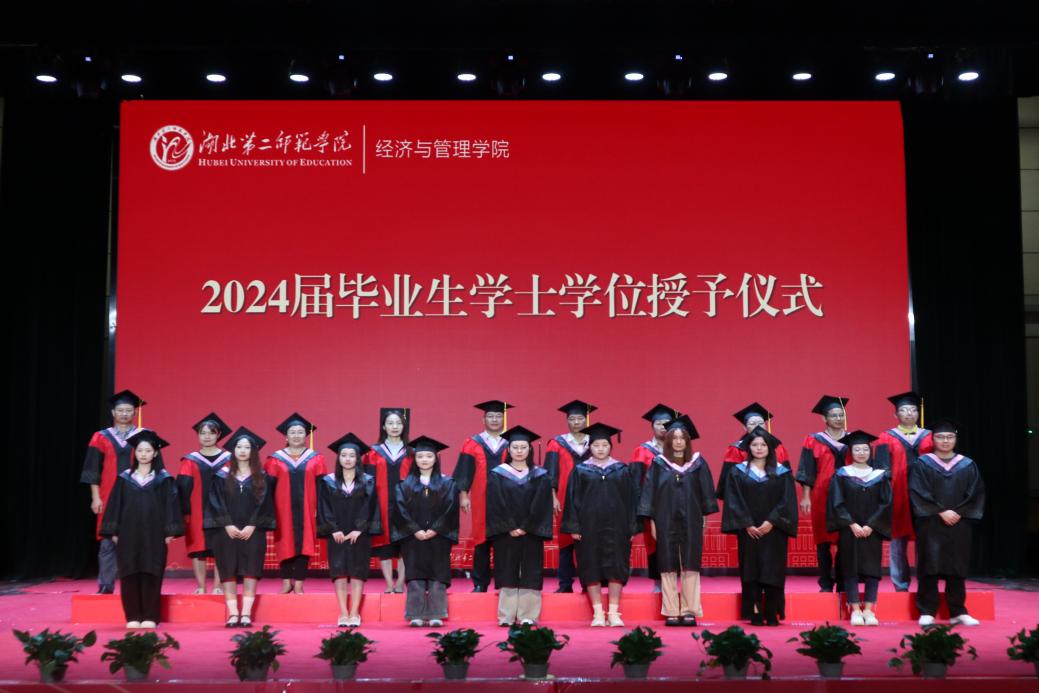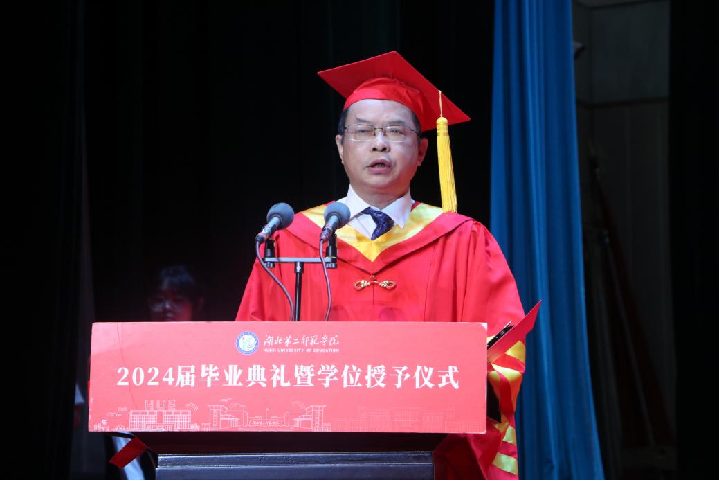 陈艳明宣读《湖北第二师范学院关于授予2024届普通本科毕业生学士学位的决定》,郑军为优秀毕业生代表拨穗并授予学位,毕业生代表为郑军献花并合影留念。