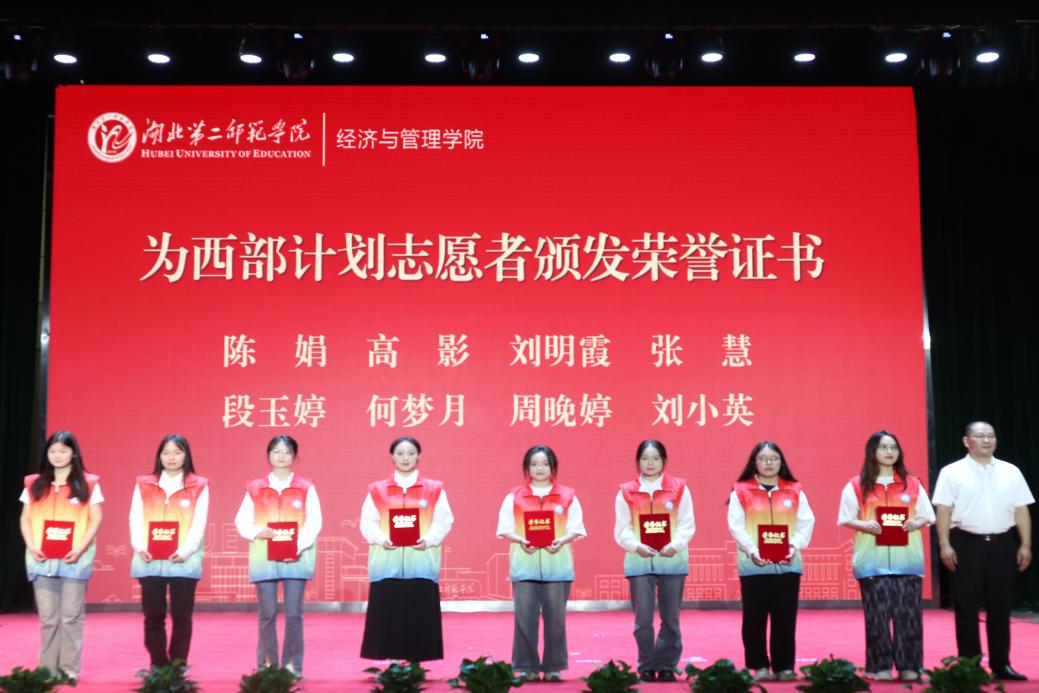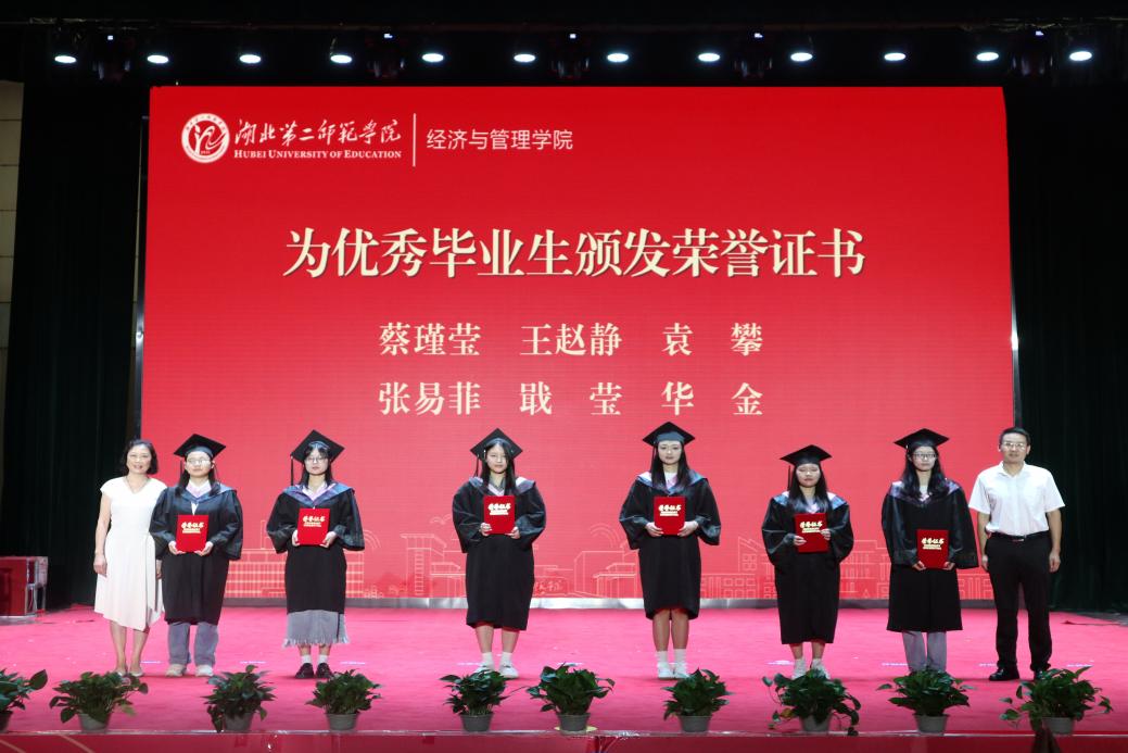 刘爱君宣读《关于表彰2024届经济与管理学院优秀毕业生、优秀实习生的决定》,蔡璐为优秀实习生代表颁奖并合影留念,王诗龙、蔡彬为优秀毕业生代表颁奖并合影留念。刘元锋为西部计划志愿者颁奖并合影留念。