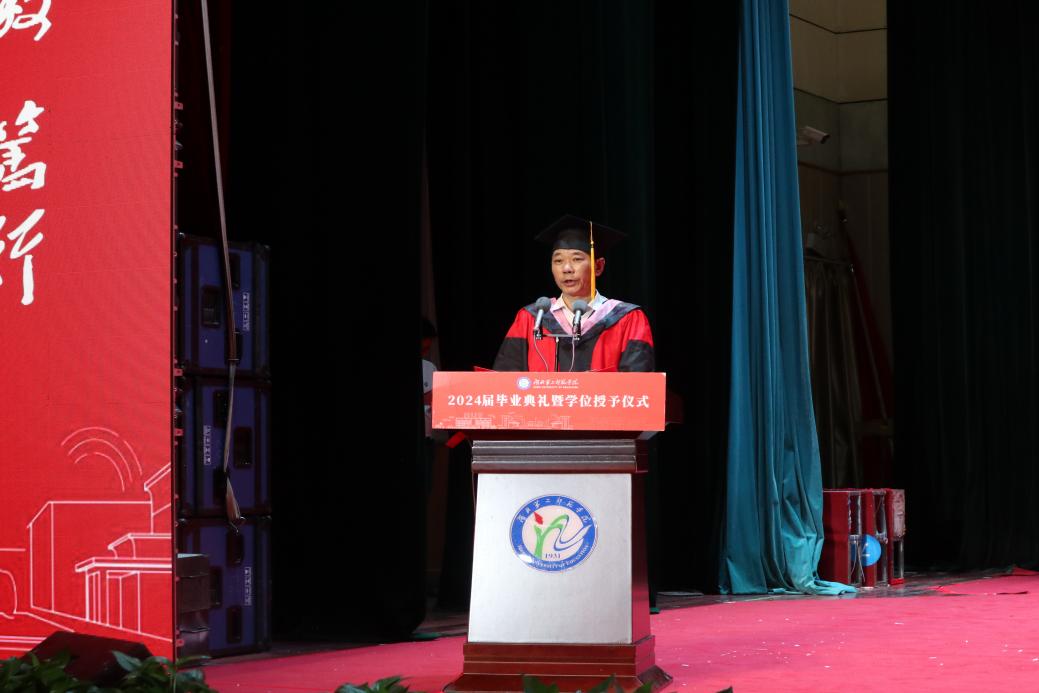郑军代表学校向经管院2024届526名毕业生表示祝贺,勉励同学们积极践行“百折不挠、追求卓越”的二师精神,把知识化为力量,为祖国发展做出贡献。他寄语广大毕业生:一是要始终坚守底线,坚守本心。二是要秉承终身学习的理念,与时俱进。三是要勤于思考,勇于创新。