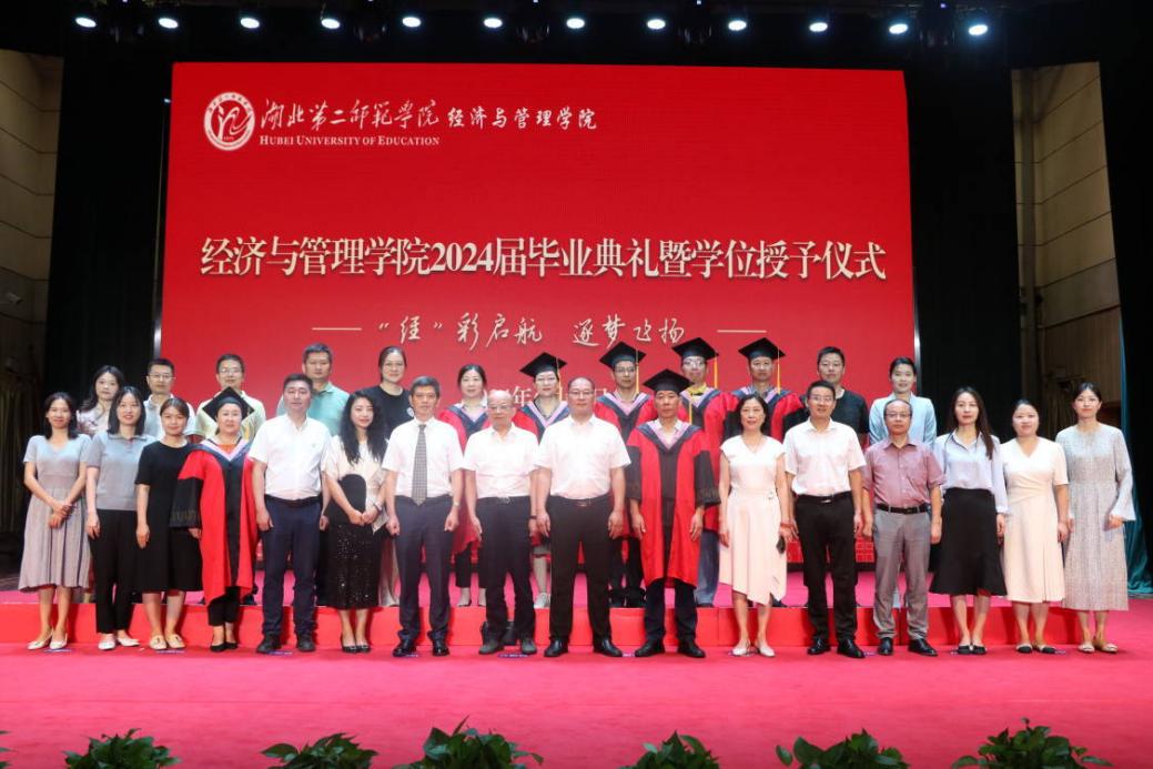本网讯(通讯员 魏雪晴)6月22日上午,经济与管理学院(以下简称“经管院”)“经”彩起航,逐梦飞扬2024届毕业典礼暨学位授予仪式于大礼堂隆重举行。校长郑军教授出席典礼并发表讲话,财务处处长王诗龙,审计处处长蔡彬,科研处处长肖明,经管院党委书记刘元锋,院长陈池波,副院长陈艳明、蔡璐,院长助理刘爱君,以及各系办主任,教师代表,毕业班辅导员和经管院2024届全体毕业生参与本次典礼,经管院党委副书记李京担任典礼主持。