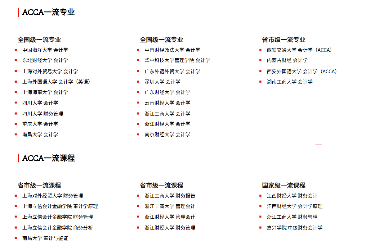 目前,已有120+所高校开设了ACCA专业方向本科,此外,华中科技大学、中南财经政法大学等众多“双一流”高校还与ACCA合作开展了专业会计硕士MPAcc+ACCA合作项目,实现ACCA课程与硕士课程的有效融合。ACCA专业学习经历将为未来升入双一流名校读研打下坚实的专业基础。