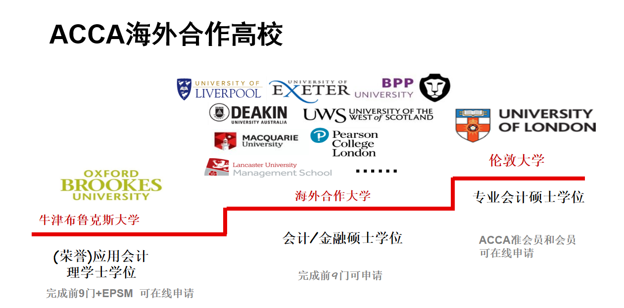 2)ACCA与众多优质海外高校也建立了合作伙伴关系,为ACCA学员提供了多种获得海外高校学历的渠道。ACCA学员可便捷地向包括这些海外优质高校的递交深造申请,学校针对ACCA推出了部分课程免修政策。学员在获得更高学历教育的同时,即可完成ACCA的学习并取得资格证书。如ACCA准会员可申请TOP名校伦敦大学硕士学位,最快半年即可获得教育部认可的世界名校学位。