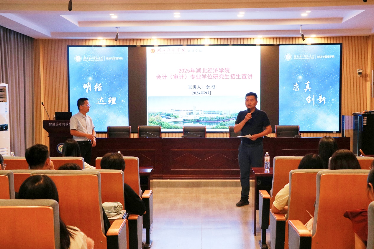 会议伊始,李京书记对湖北经济学院宣讲老师一行表示热烈欢迎,简单介绍学院学生学业情况和考研意向。湖北经济学院副院长余浪向意向学子们介绍了会计学院舒适安心的教学环境和优秀庞大的师资队伍,重点分享了全国闻名的学科MPACC的成功办学经验,对意向报名MPACC的二师学子表示欢迎。余浪院长希望两校保持长久合作关系,共同加强学校交流往来和学科学院协同建设。