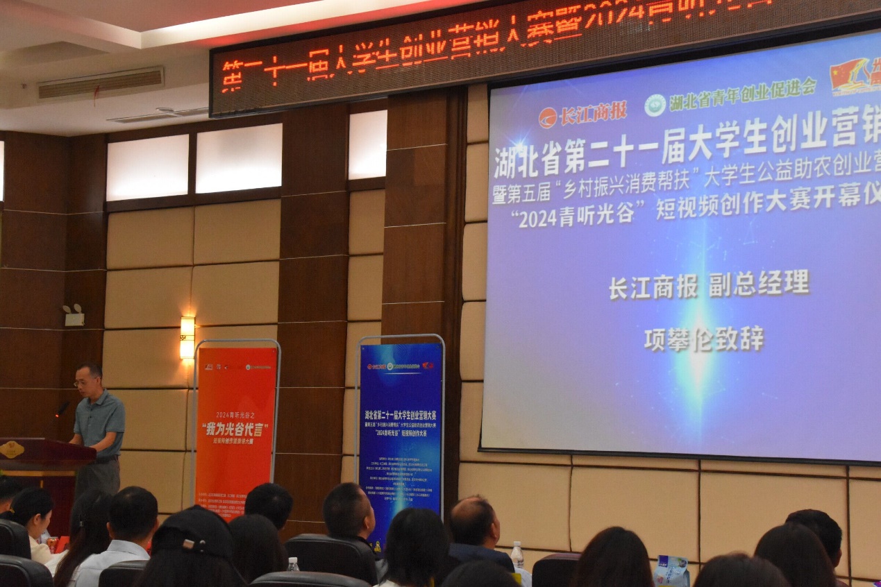 长江商报副总经理项攀伦在开幕式上致辞,他指出大学生需要掌握有效思考、清晰沟通的能力,具备判断能力和批判性价值能力,更要掌握共传、选择、整合、迁移、创新能力等一系列专业知识和技能,大学生创业营销大赛是一个绝佳的锻炼舞台,同学们可以在其中迅速成长起来。