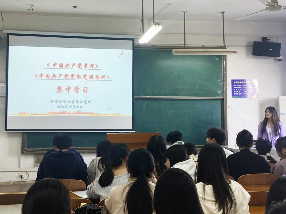 本网讯(见习记者 刘思羽)10月31日下午,经济与管理学院分党校于二号楼2303教室开展预备党员培训班《中国共产党章程》和《中国共产党党徽党旗条例》的集中学习,分党校全体预备党员参加。