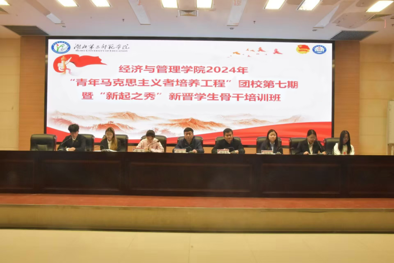 本网讯(通讯员 何心怡 梁中秋)11月22日中午,经济与管理学院(以下简称“经管院”)2024年“青年马克思主义者培养工程”团校第七期暨“新起之秀”新晋学生骨干培训班开班典礼在图书馆1号报告厅开展,经管院党委副书记李京,学工办主任周慧东,团委负责人徐梅馨,学生会指导老师张泉出席本次活动,经管院24届分团委、学生会以及大学生心理联合发展协会的所有成员参加本次活动,学生会主席团成员万晨晓担任主持人。