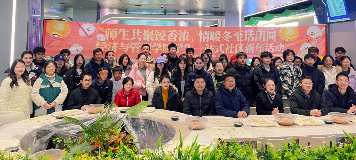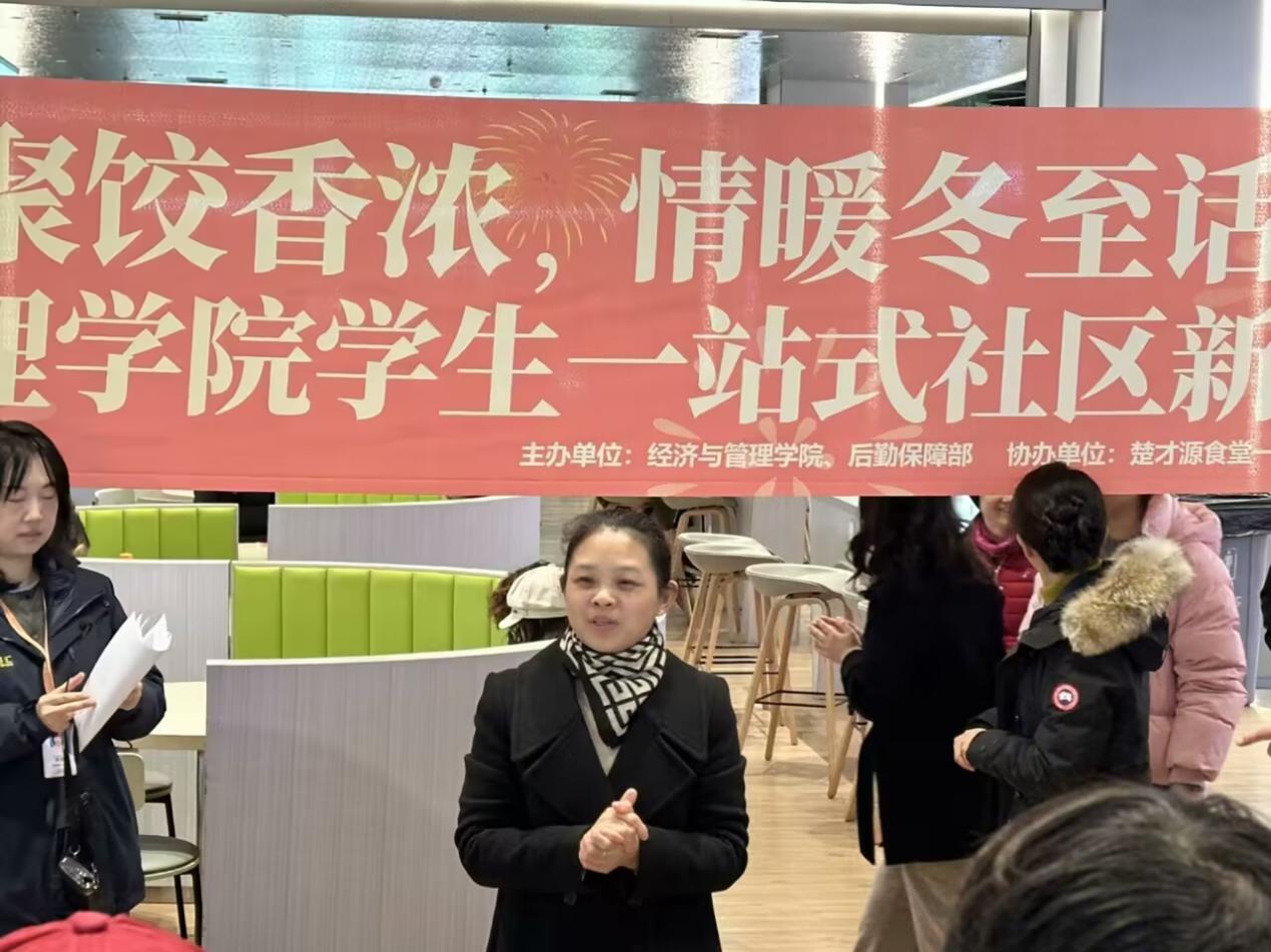 本网讯(通讯员 刘志杰)岁寒又冬至,团圆正当时。为进一步弘扬中国优秀传统文化,增强学生凝聚力和归属感,12月20日下午,经济与管理学院(以下简称“经管院”)于楚才源食堂一楼开展主题为“师生共聚饺香浓,情暖冬至话团圆”的学生一站式社区新年活动。学生工作部、人民武装部部长文敏,审计处处长宋金江,后勤保障部党总支书记刘晖,后勤保障部部长吴晓健,财务处副处长王勇、刘杰,经管院党委副书记李京、副院长常静、学工办主任周慧东出席本次活动。